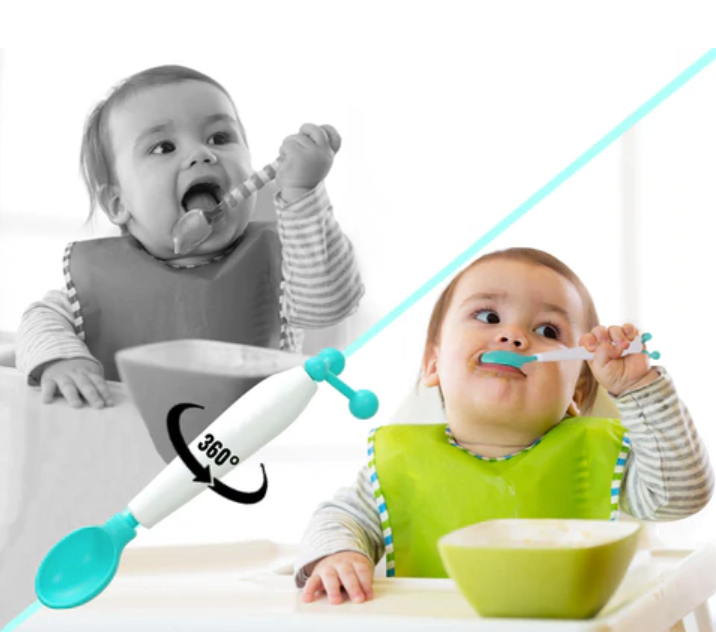 Att lära sig äta med redskap är aldrig lätt. Mat ramlar ofta ner på barnets kläder innan det når dennes mun. Misströsta inte längre, den nya 360° skeden är utformad för att hjälpa dig dagligen!