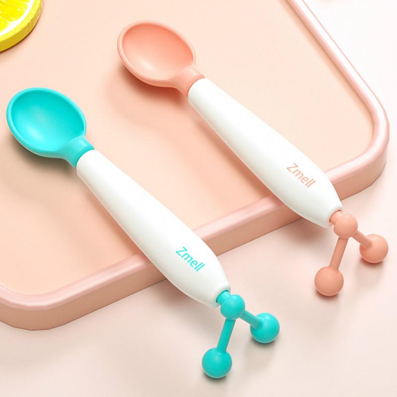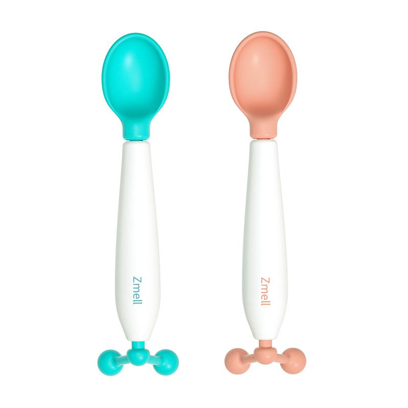 Den följer barnet i dennes lärande under måltiderna. Tack vare det roterande handtaget och den lilla vikten som finns i slutet förblir 360° skeden alltid horisontell och förhindrar att dess innehåll spills, oavsett handtagets position.
