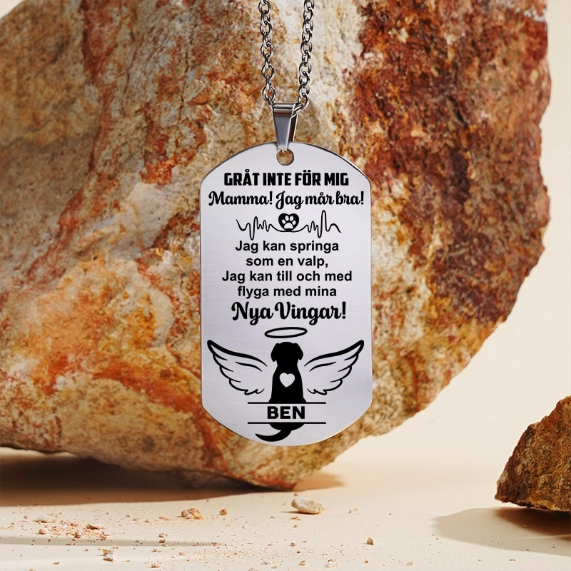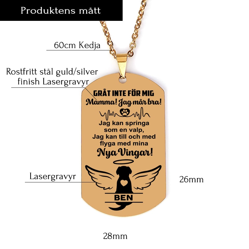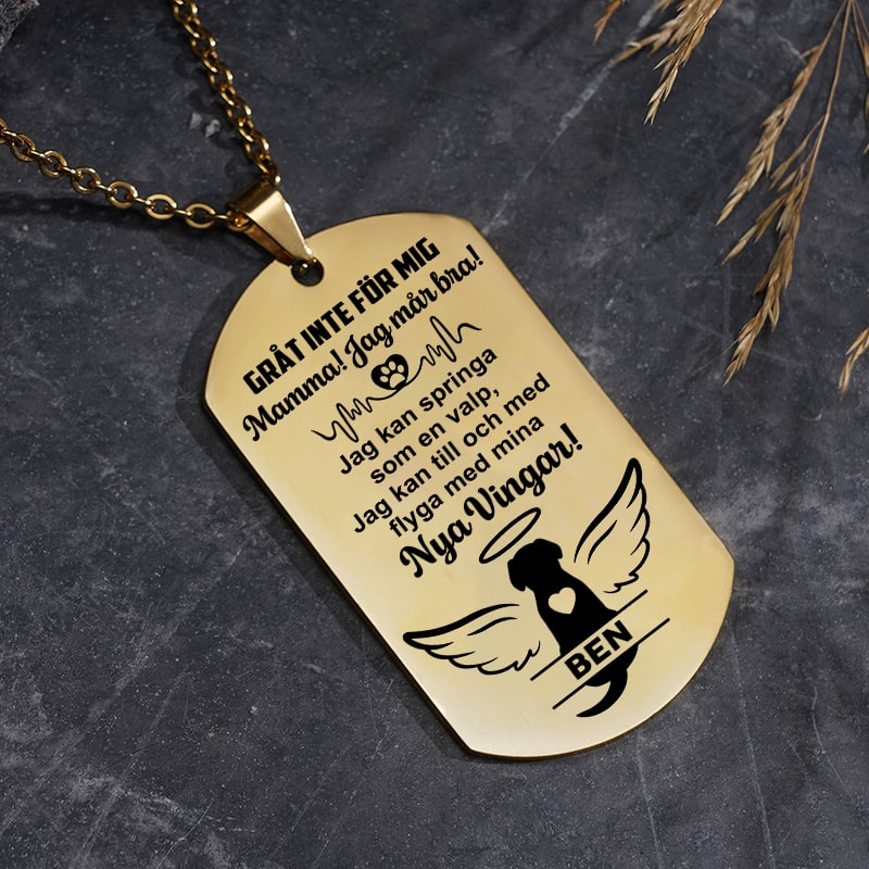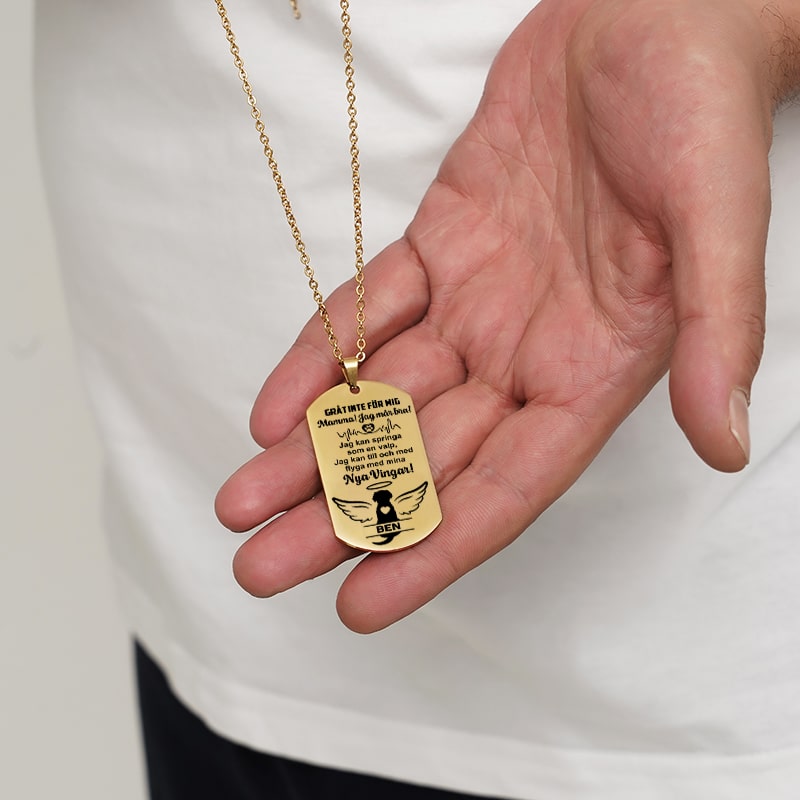 Detaljer:• Varje stycke är gjort av högkvalitativt stål med silver- och guldplätering. Vi använder en högkvalitativ laser för att bevara inskriptionens skönhet, finhet och klarhet.• Alla våra smycken är skyddade mot missfärgningar. Vi vill skapa hållbara objekt som alla kan uppskatta, oavsett prisklass.• Vi förpackar varje hängsmycke med en kedja i en presentförpackning så att du lätt kan ge bort hängsmycket till den du älskar.• Varje design och inskrift har utformats omsorgsfullt av våra designers för att motsvara våra kunders alla behov.Produktmått:• Halsbandets längd: 60 cm, justerbart• Hänge: 22mm×51mm• KarbinhakeGaranterat nöjdVi jobbar konstant på att ge dig de bästa alternativen för graverade hängsmycken som du kan lägga händerna på. Vi vet att varje kund är unik. Det är därför som vi hela tiden håller kontakten med våra kunder för att bättre kunna förstå vad de vill ha. Förutom vår smyckedesigns visuella aspekt är vi säkra på att ditt köp kommer att behaga dig under lång tid framöver.Vanliga frågor:F: Är märkningens text ingraverad?S: Ja, hängsmyckets inskrift och design är ingraverade. Det är inget klistermärke och du kan vara säker på att bokstäverna inte bleknar med tiden, oavsett hantering.F: Kan jag märka smycket med min egen text/signatur?S: Vi gör för tillfället inga skräddarsydda beställningar, men du kan ta en titt på vår samling och välja en annan tillgänglig text, design eller form.F: Vad ingår i setet?S: Vi förpackar varje hängsmycke med en kedja i en presentförpackning så att du lätt kan ge bort hängsmycket till den du älskar.F: Hur får jag mina smycken att se ut som nya?S: Det är inte tillrådligt att använda hushållsrengöringsmedel och parfym på stålsmycken då dessa kan skada produktens yta. Tvål kan användas för att ta bort smuts. För att undvika att repa ytan rekommenderar vi att du torkar av produkten med en mjuk trasa.