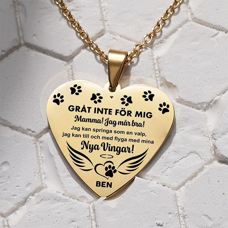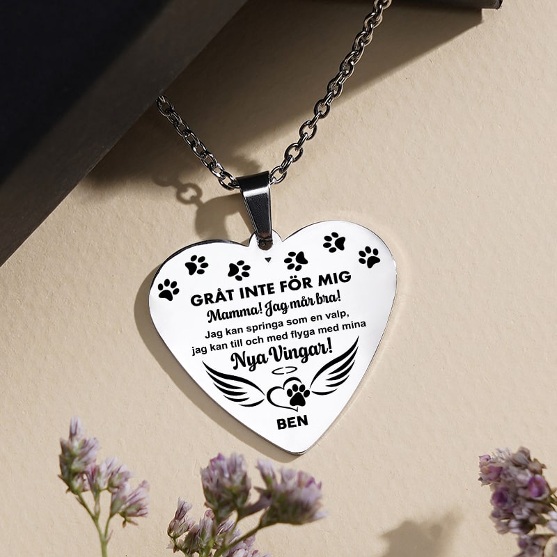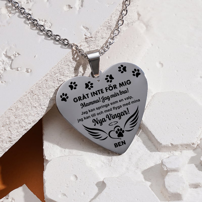 Ett personligt minne för dig att bära med dig var du än är, av de speciella minnen du har från de fina åren du haft tillsammans med din underbara följeslagare genom livet. Gör detta minneshalsband personligt med namn och foto på en person eller ett husdjur som du har förlorat och fortfarande håller kär. Det perfekta sättet att alltid hålla din skyddsängel nära dig.